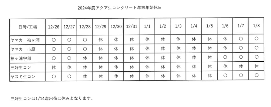 組合工場の、年末年始スケジュールは、以下の通りになります。