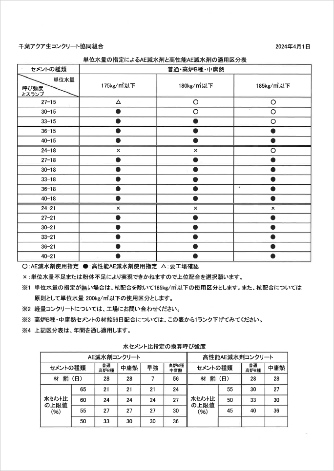 単位水量の指定によるAE減水剤と高性能AE減水剤の適用区分表